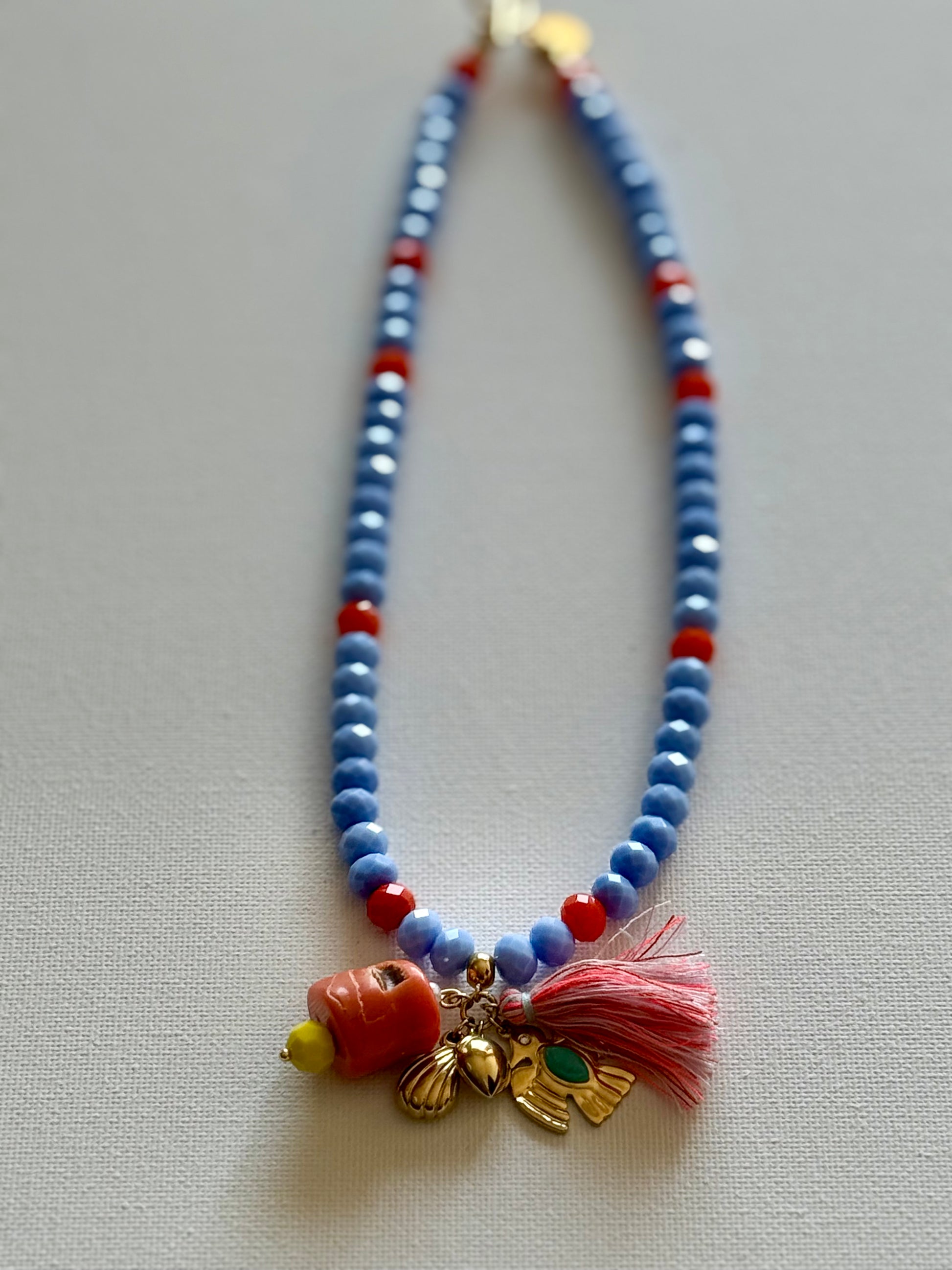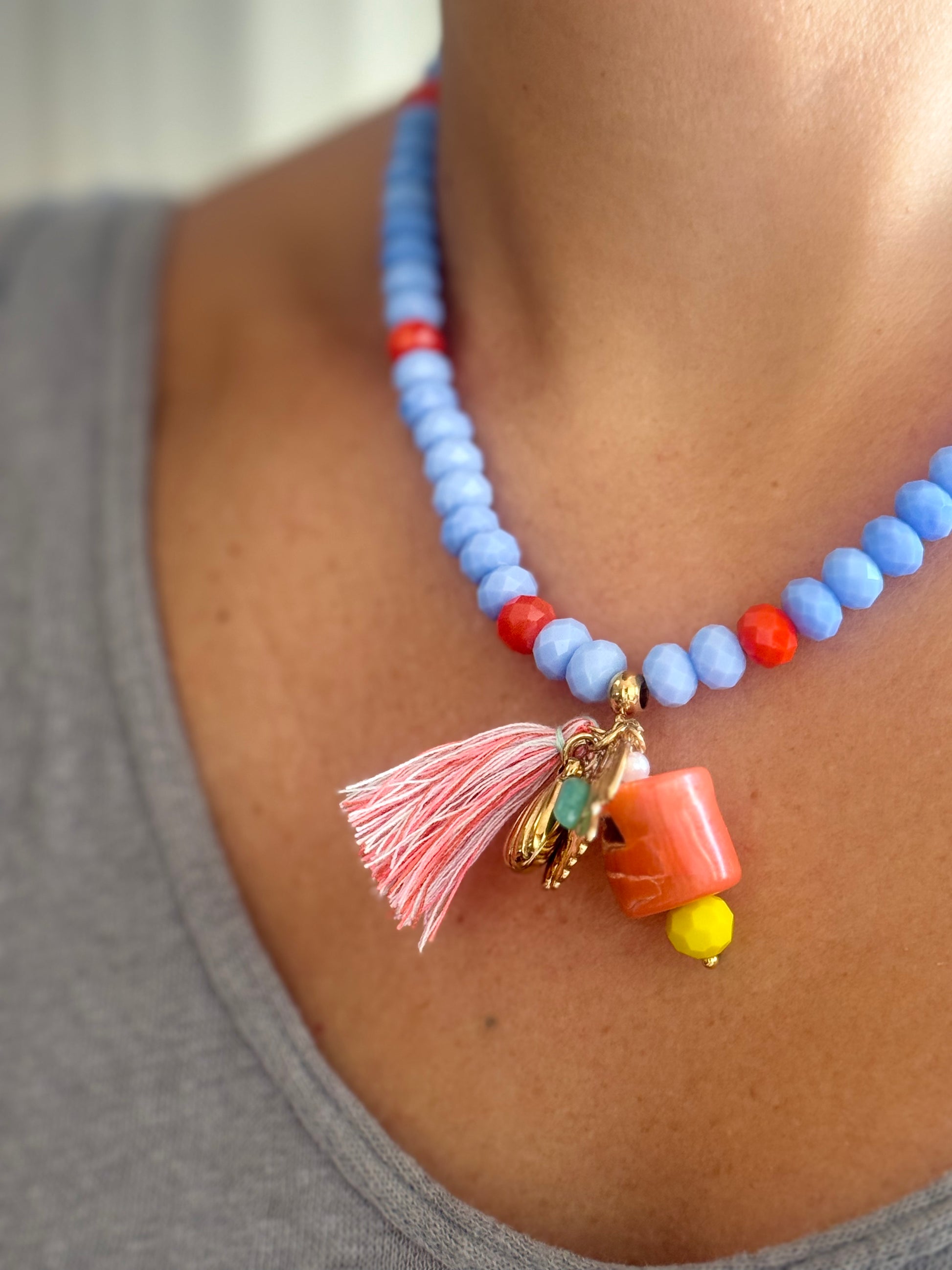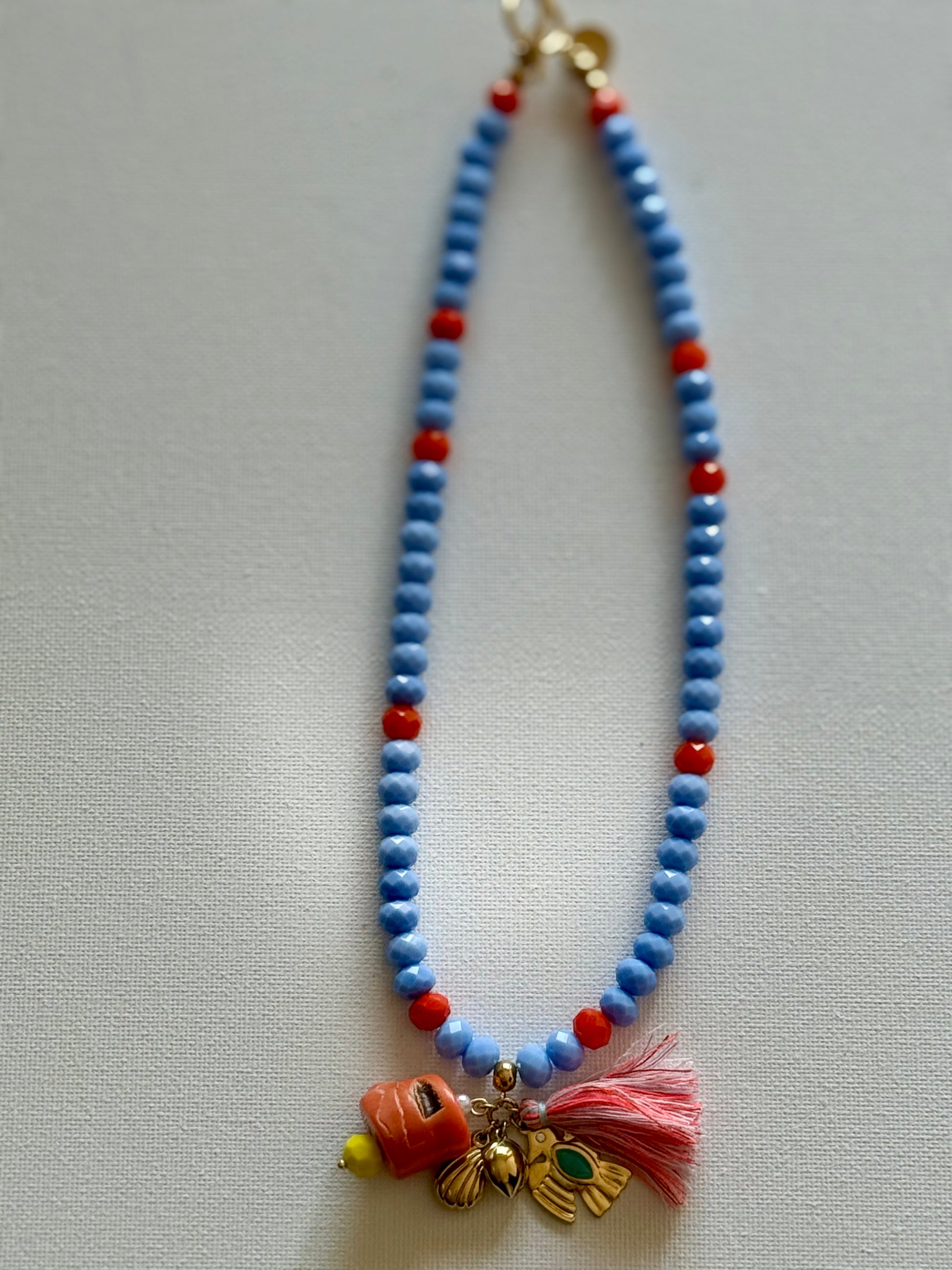 Colar Bicolar de Pedras Azuis e Laranja com vários pendentes em aço.