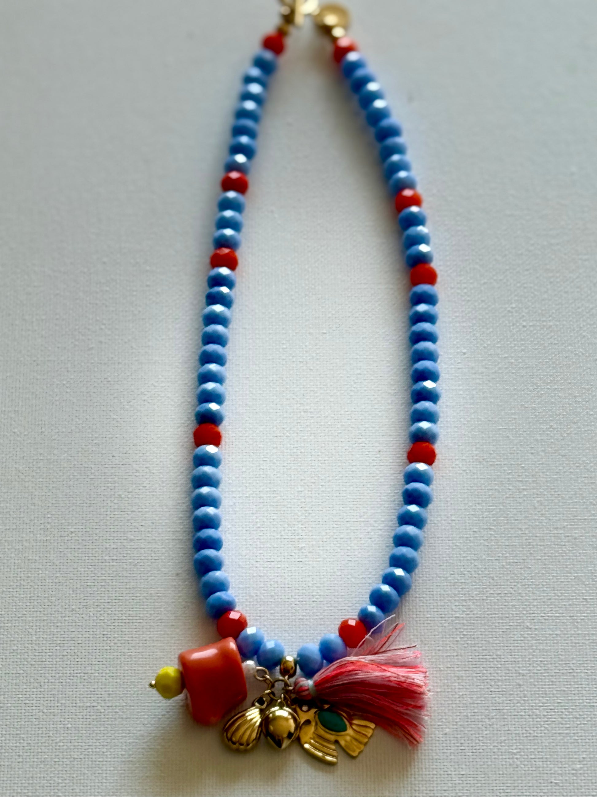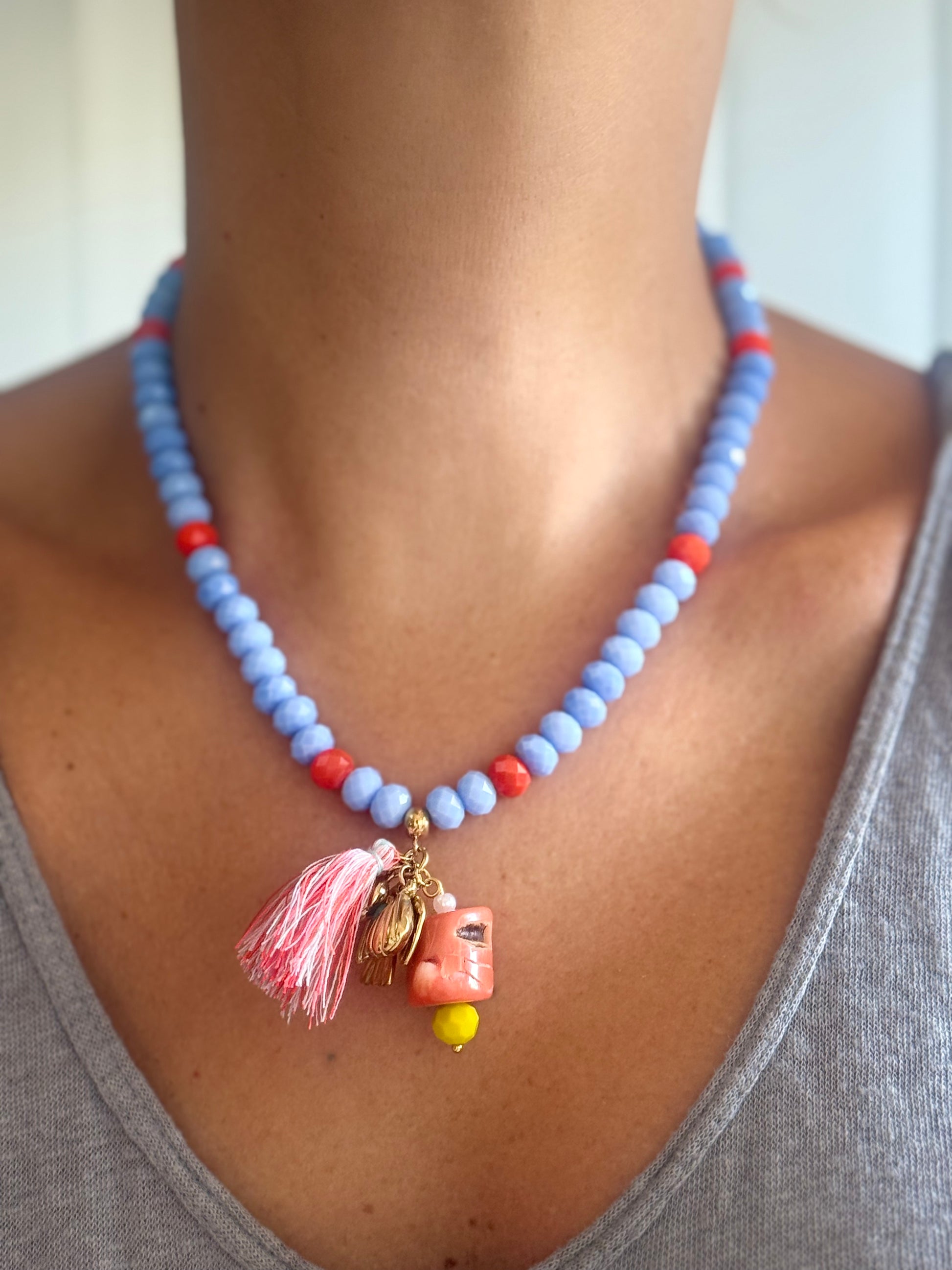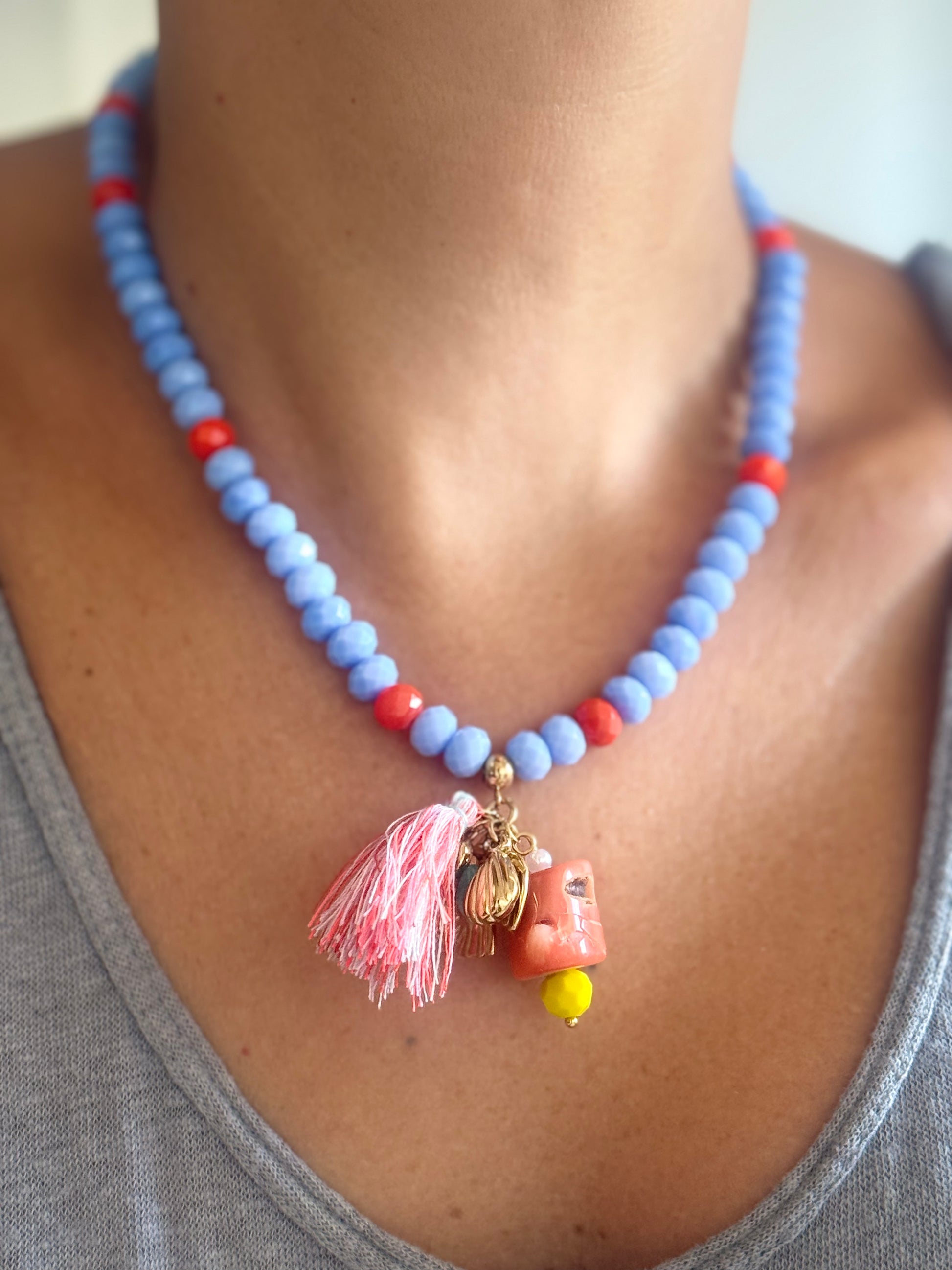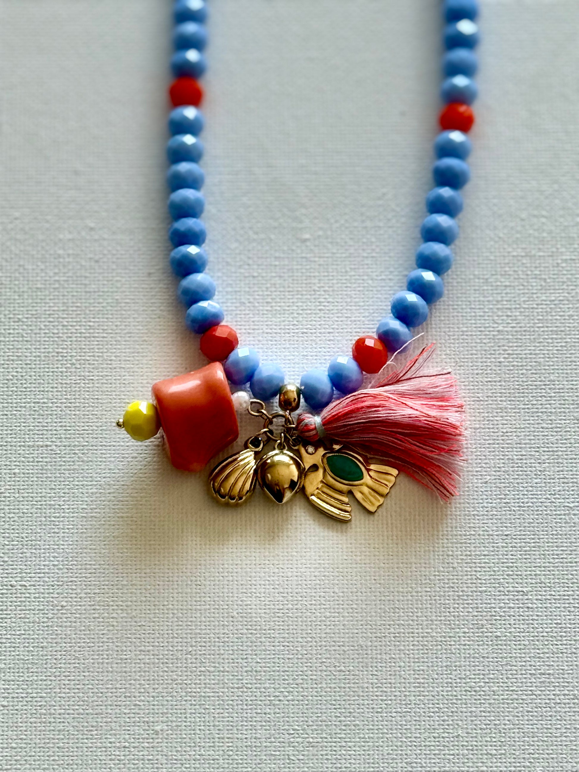 Colar Bicolar de Pedras Azuis e Laranja com vários pendentes em aço.