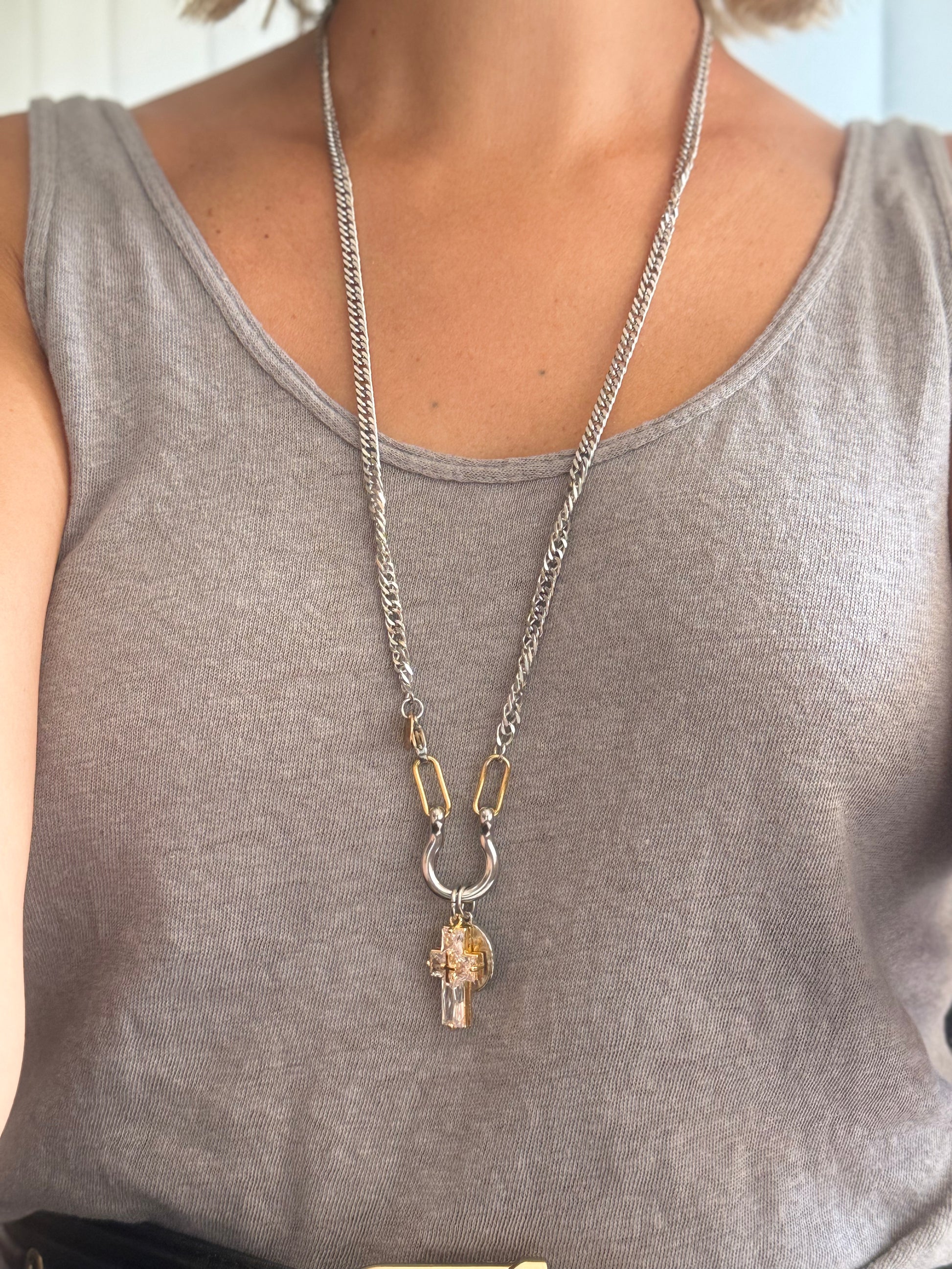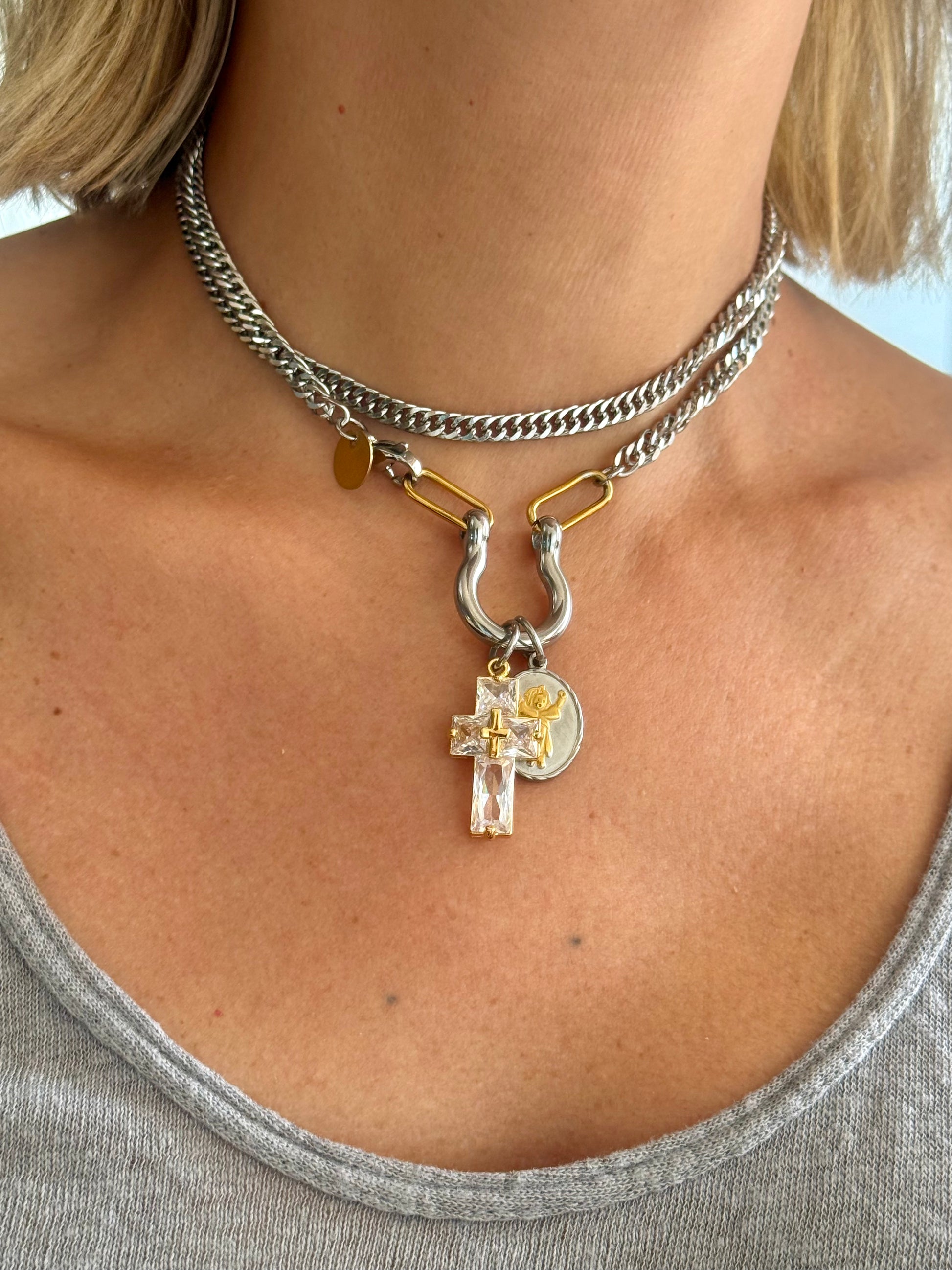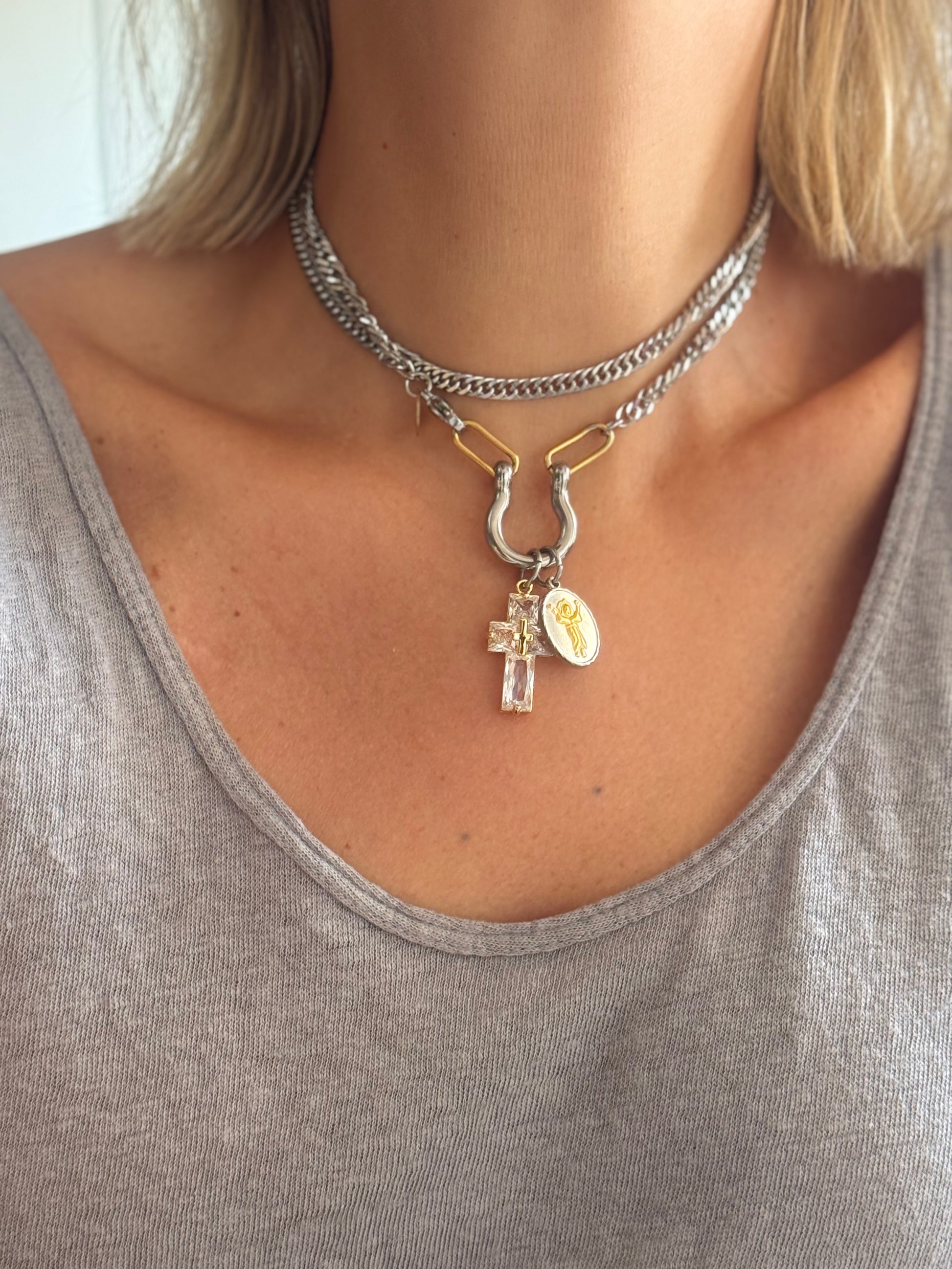 Colar Bicolor de Aloquete com 2 pendentes e pormenores dourados. Todo o colar em aço. Possível dar 2 voltas.