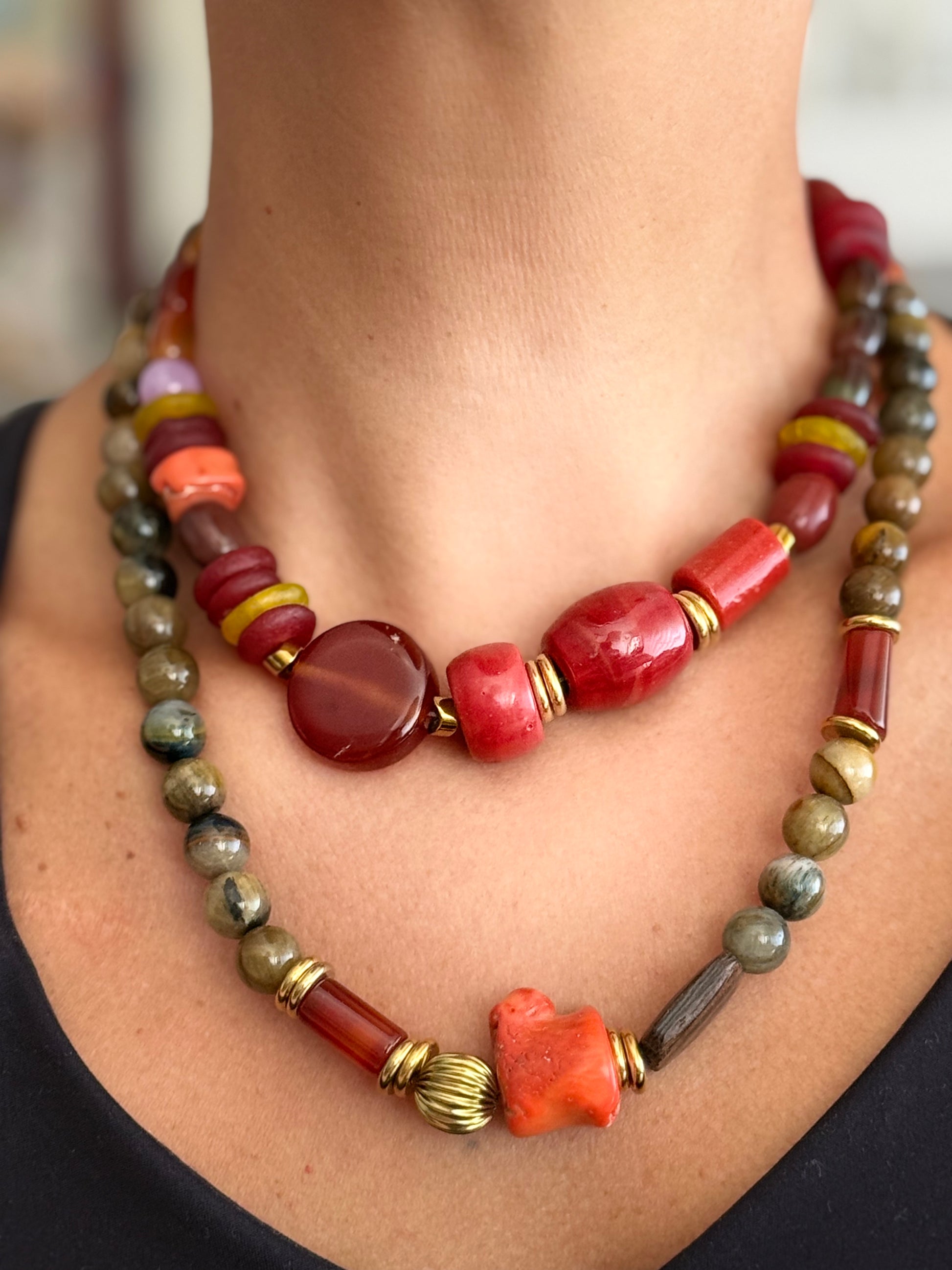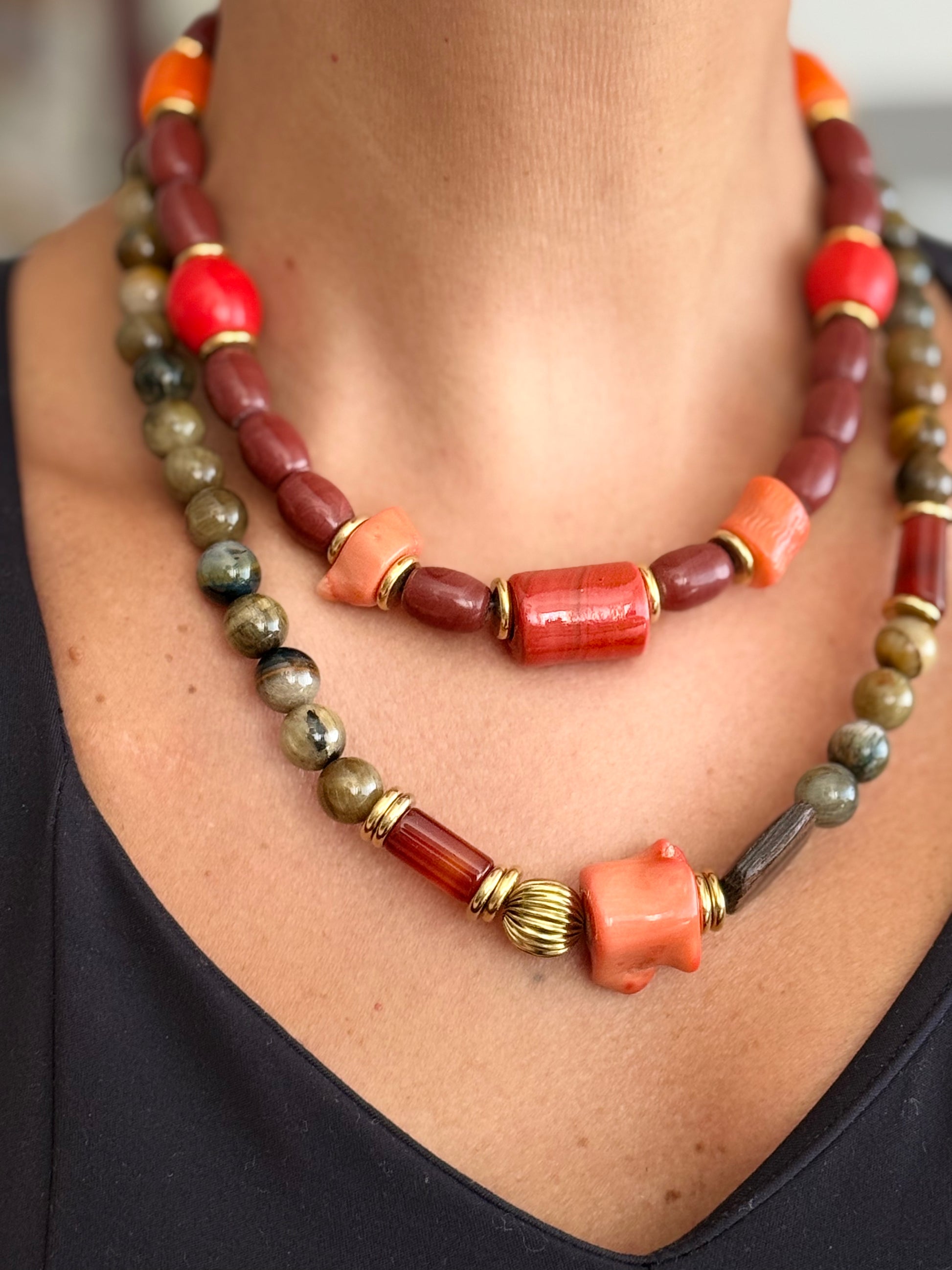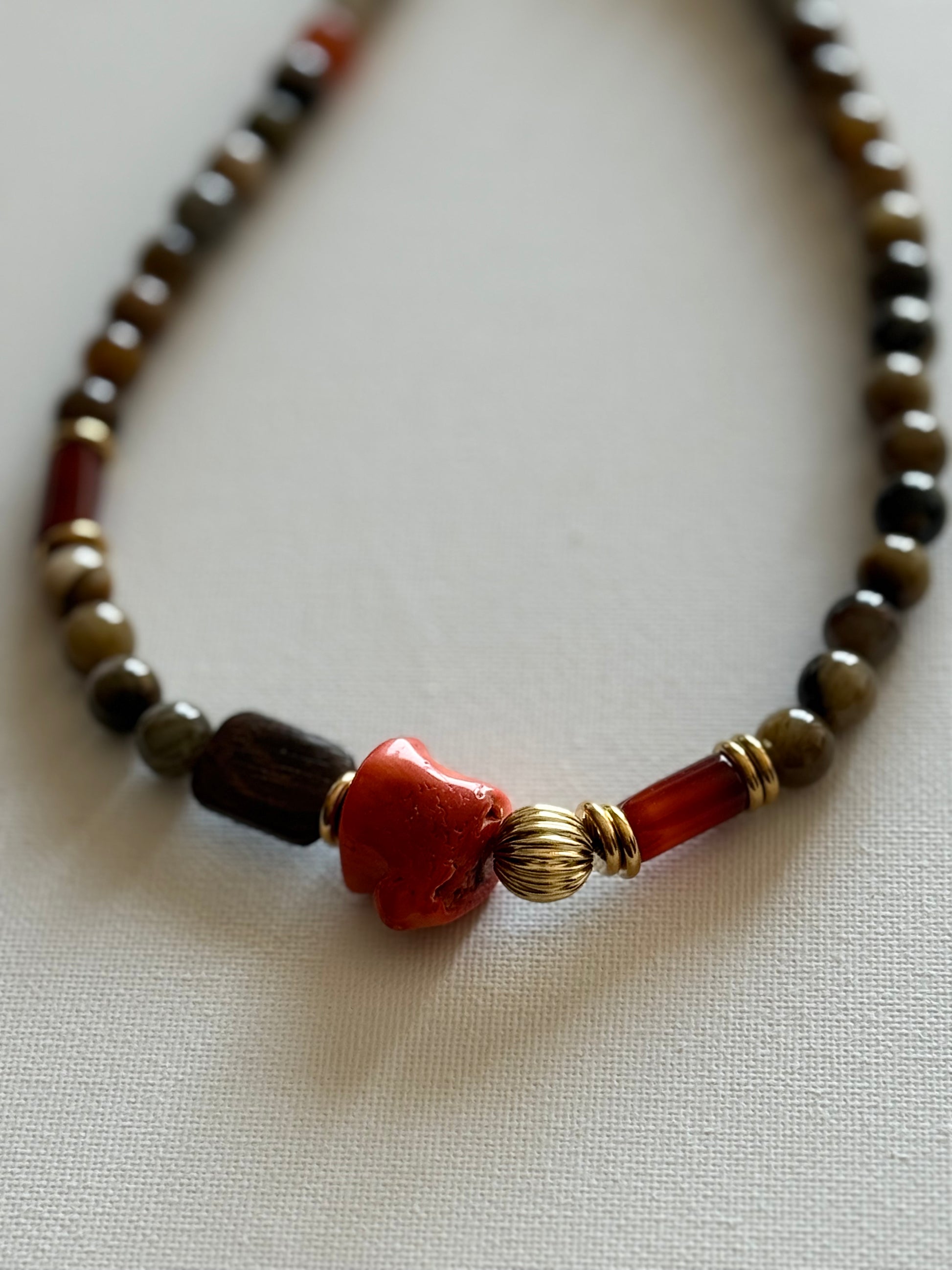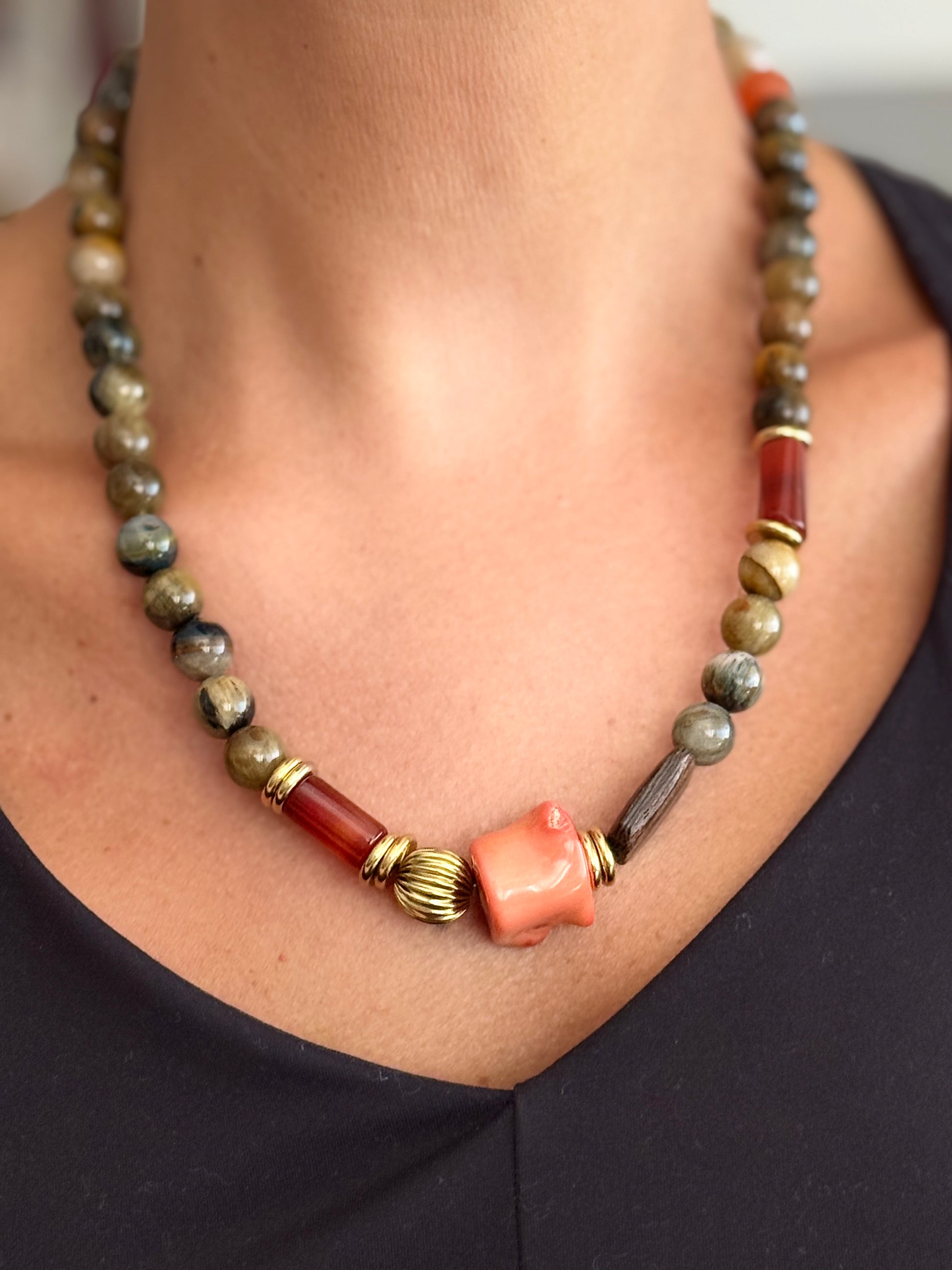 Colar Pedra Olho de Tigre e Coral. Entremeios em aço.
